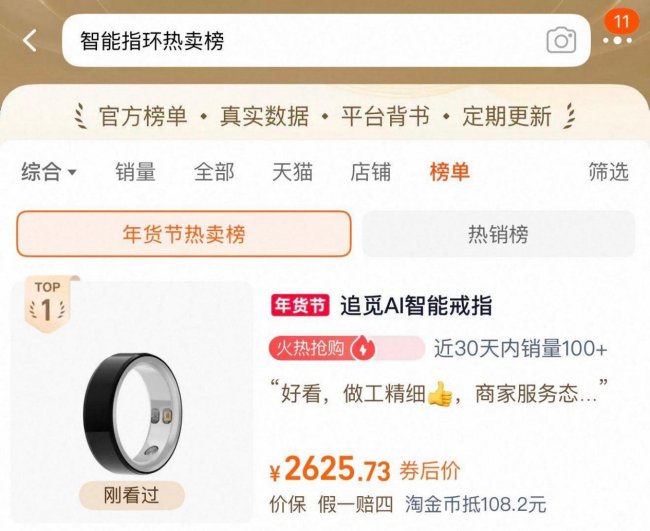 以春晚同款戒指登陆央视之前,受益于智能穿戴赛道的快速增长,这一枚戒指已经创造了单一品类的增速“神话”。上市仅一个月,订单快速突破千万元,上市仅三个月登顶天猫热销榜。在今年2月,撒贝宁亲手佩戴更将其推向国民级热度。