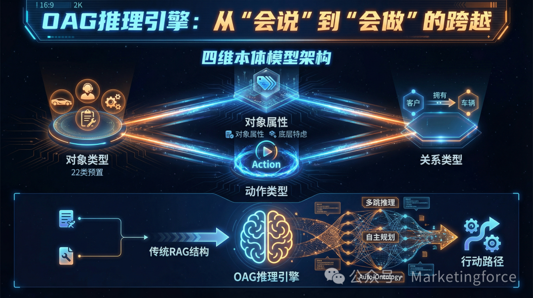 传统RAG(检索增强生成)模式依赖关键词匹配进行信息检索,难以处理需要多步逻辑推理的复杂业务场景。OntologyForceOS搭载的OAG(Ontology Augmented Generation)推理引擎突破了这一限制。该引擎具备多跳推理能力,能够在业务逻辑边界内进行自主规划与路径选择,从历史数据中自动提取知识并构建决策链条。