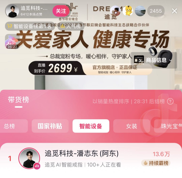 品牌的华丽叙事终究需要市场的真金白银来验证。追觅AI智能戒指自2025年11月正式上市以来,增长态势近乎陡峭:首月订单快速突破千万元,上线两个月即登顶天猫智能戒指热销榜TOP1,春节期间再度蝉联榜首;进入2026年第一季度,全渠道GMV环比增长616%,成为智能穿戴赛道中增长最迅猛的核心单品。在更广泛的平台维度上,追觅几乎实现了“全平台制霸”——不仅天猫长期霸榜,抖音平台同样拿下智能戒指带货榜TOP1,抖音电商智能戒指带货榜与天猫智能戒指热销榜双榜长期占据榜首。此外,追觅全球AI硬件事业群总裁潘志东的抖音直播间表现亮眼,持续登顶抖音智能设备品牌同时段TOP1。