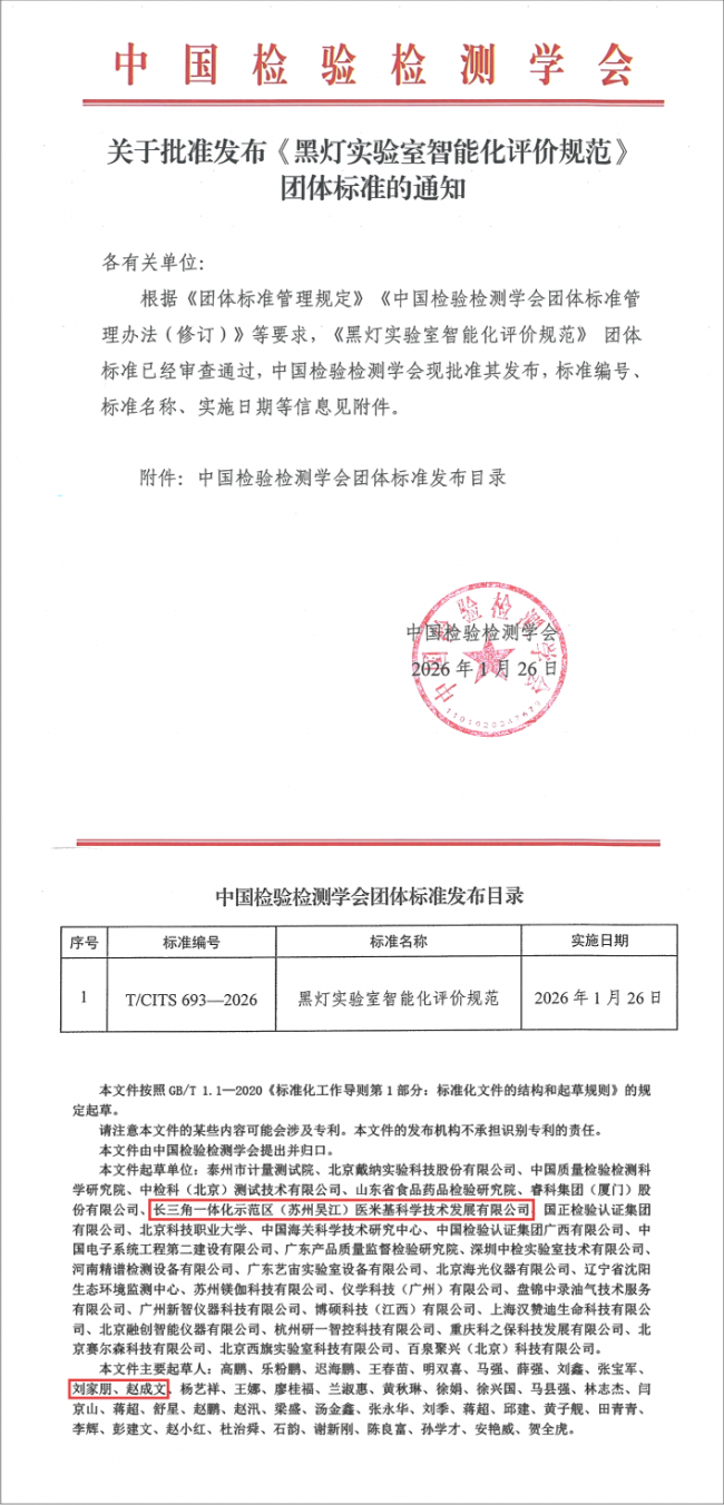 技术的成熟与需求的爆发,呼唤评价体系与行业规范的建立。汇像科技作为核心起草单位之一,旗下医米基科学,参与编制了中国检验检测学会《黑灯实验室智能化评价规范》(标准编号:T/CITS 693—2026)团体标准。